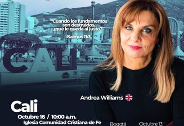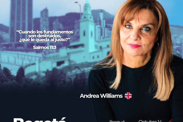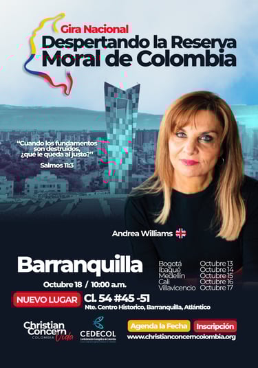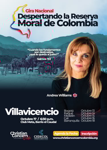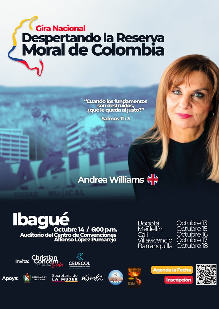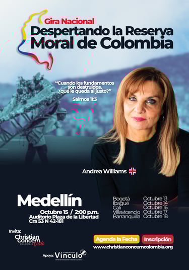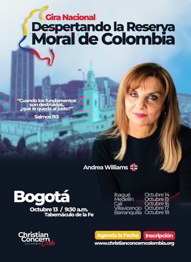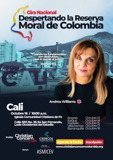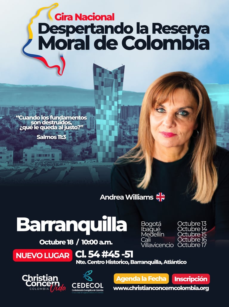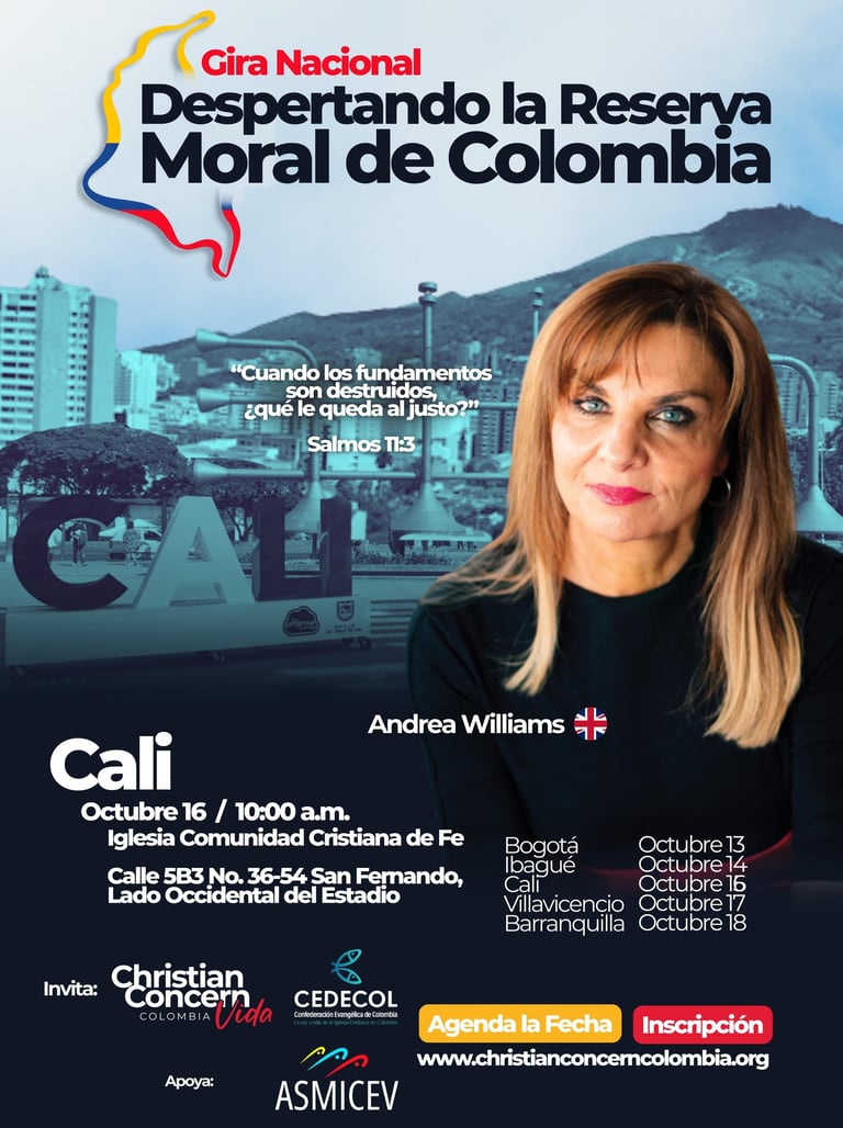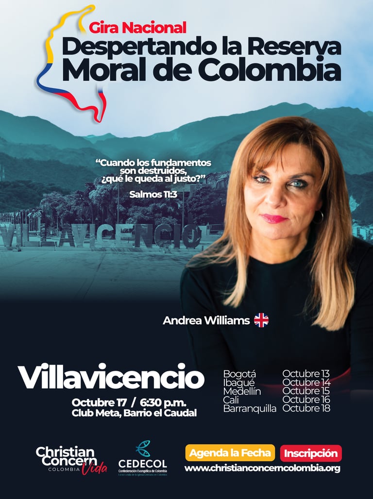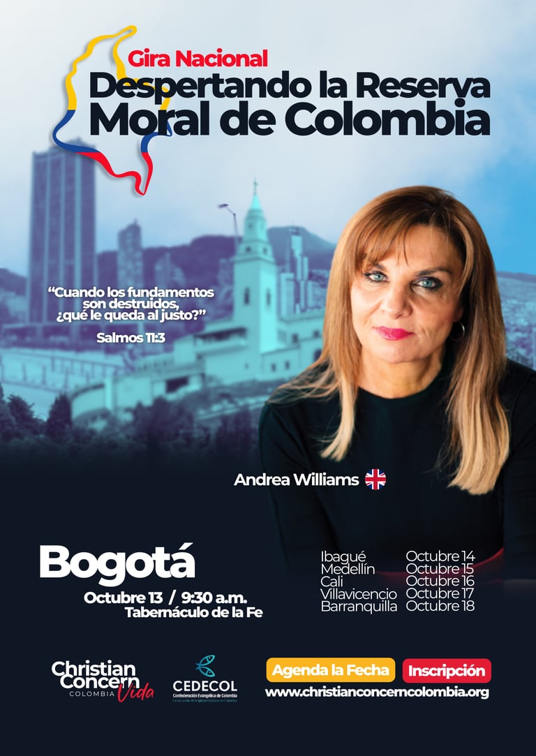 Es una serie de encuentros en seis ciudades del país, con la participación especial de Andrea Williams, reconocida defensora de la fe cristiana en Europa. El propósito es movilizar a la Iglesia colombiana a responder con valentía frente a la crisis moral que enfrenta nuestra nación.