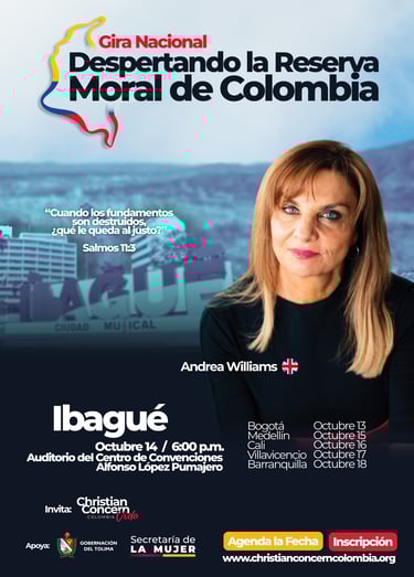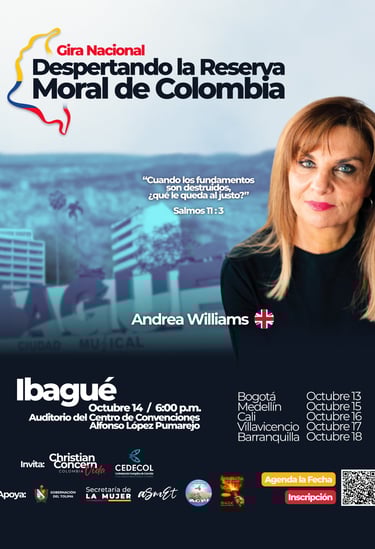 A través de la gira nacional con Andrea Williams, aspiramos a despertar la reserva moral de Colombia, llevando un mensaje de esperanza y acción a seis ciudades clave.